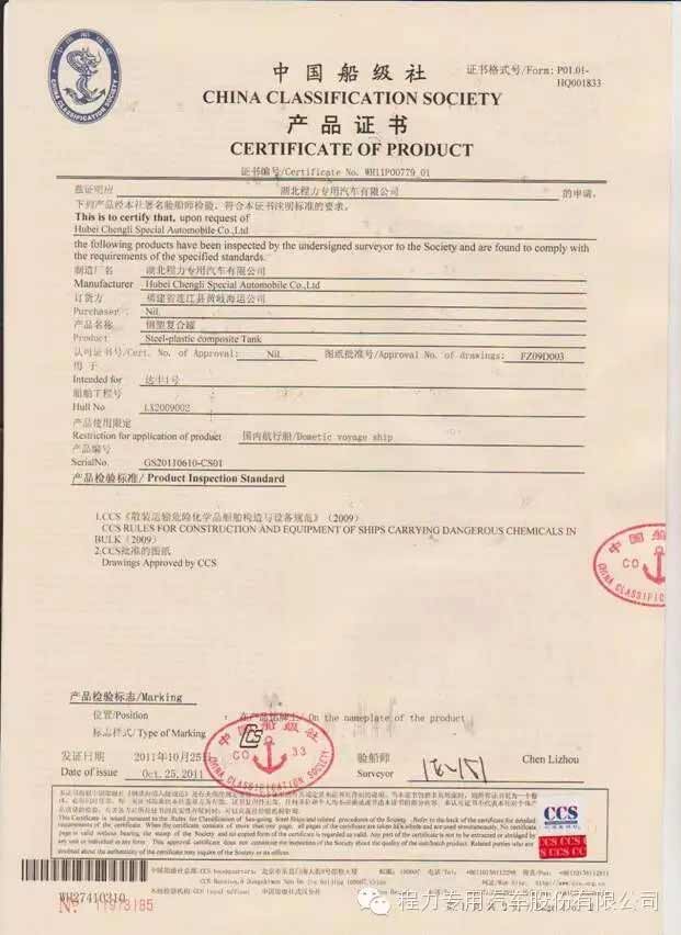 同時(shí)湖北程力專用汽車有限公司還有船用襯塑罐已獲中國船級(jí)社認(rèn)證